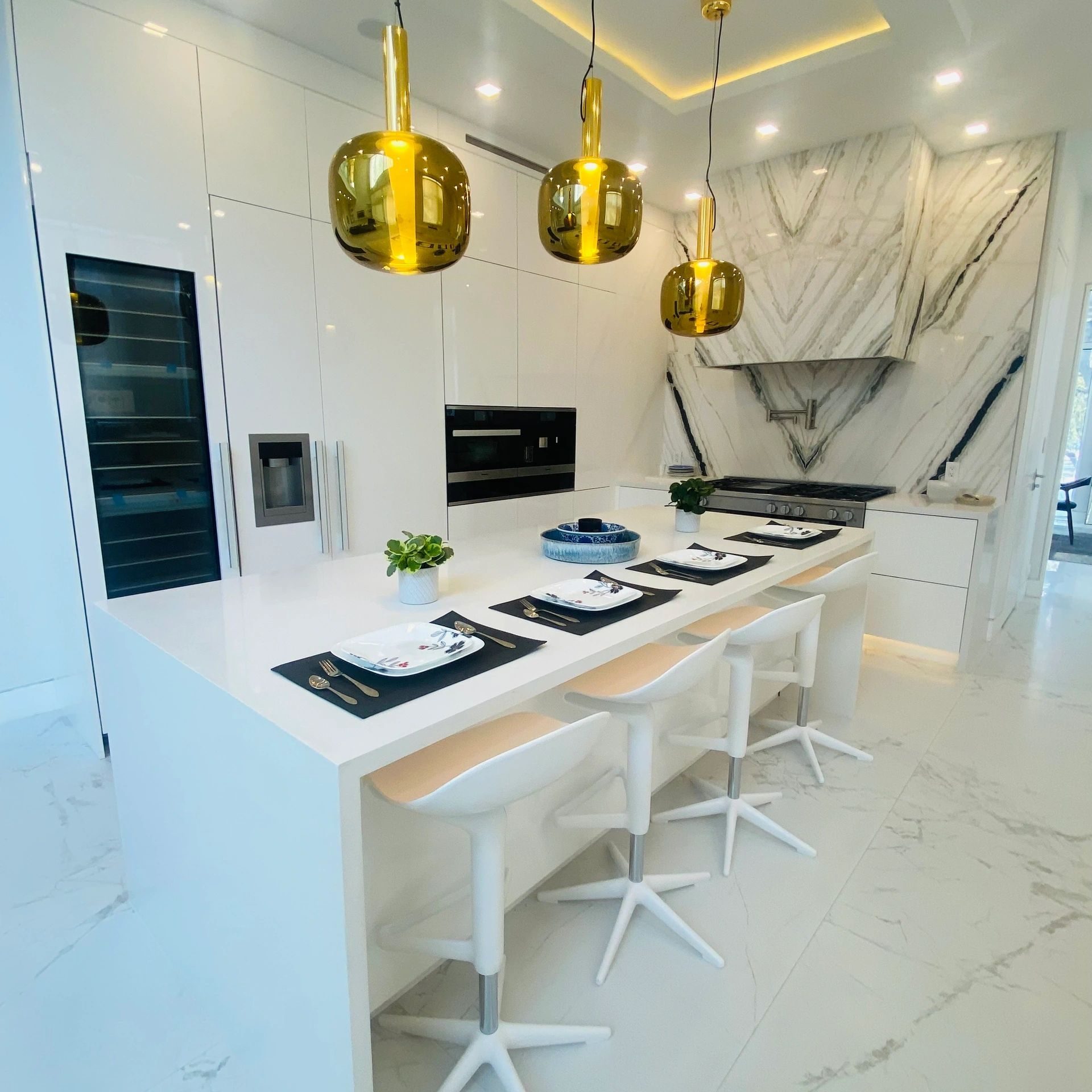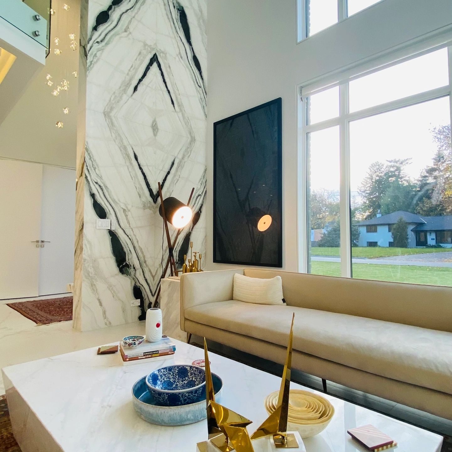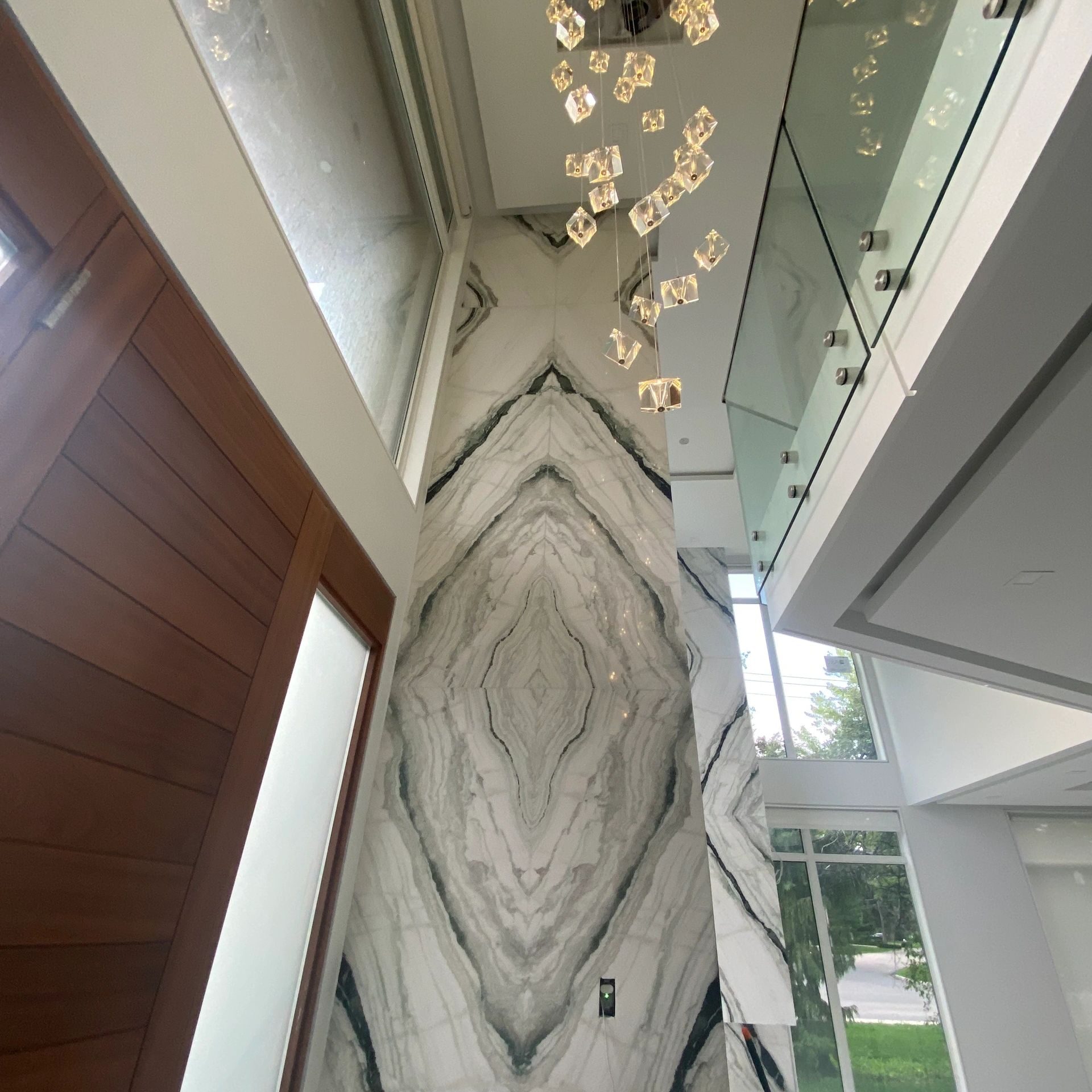 Interior building materials – Multiple marble fireplaces (including Italian Carrara), marble for flooring and accent walls, floating staircase and glass railing, exotic shiplap teak wood for ceiling, wide-plank hardwood, herringbone hardwood, interior doors, kitchen and whole-house high-gloss cabinets etc.