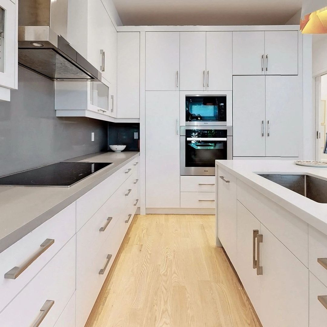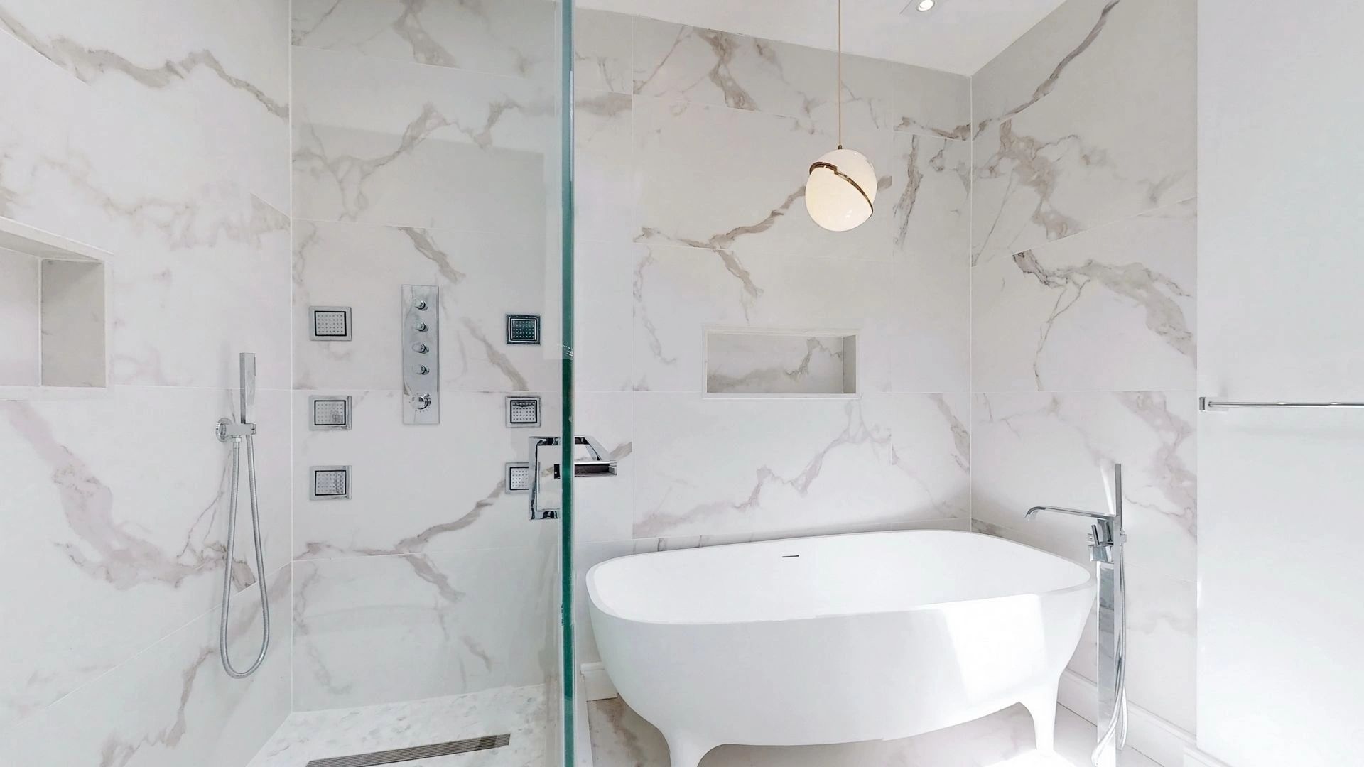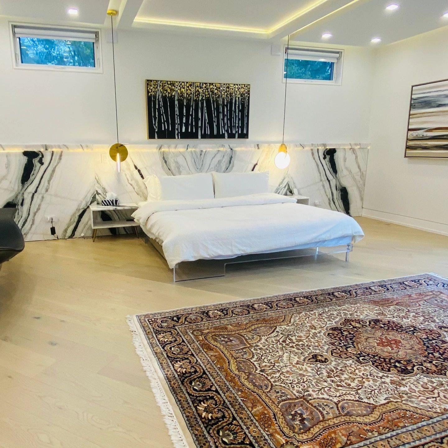 Interior building materials – Multiple marble fireplaces (including Italian Carrara), marble for flooring and accent walls, floating staircase and glass railing, exotic shiplap teak wood for ceiling, wide-plank hardwood, herringbone hardwood, interior doors, kitchen and whole-house high-gloss cabinets etc.